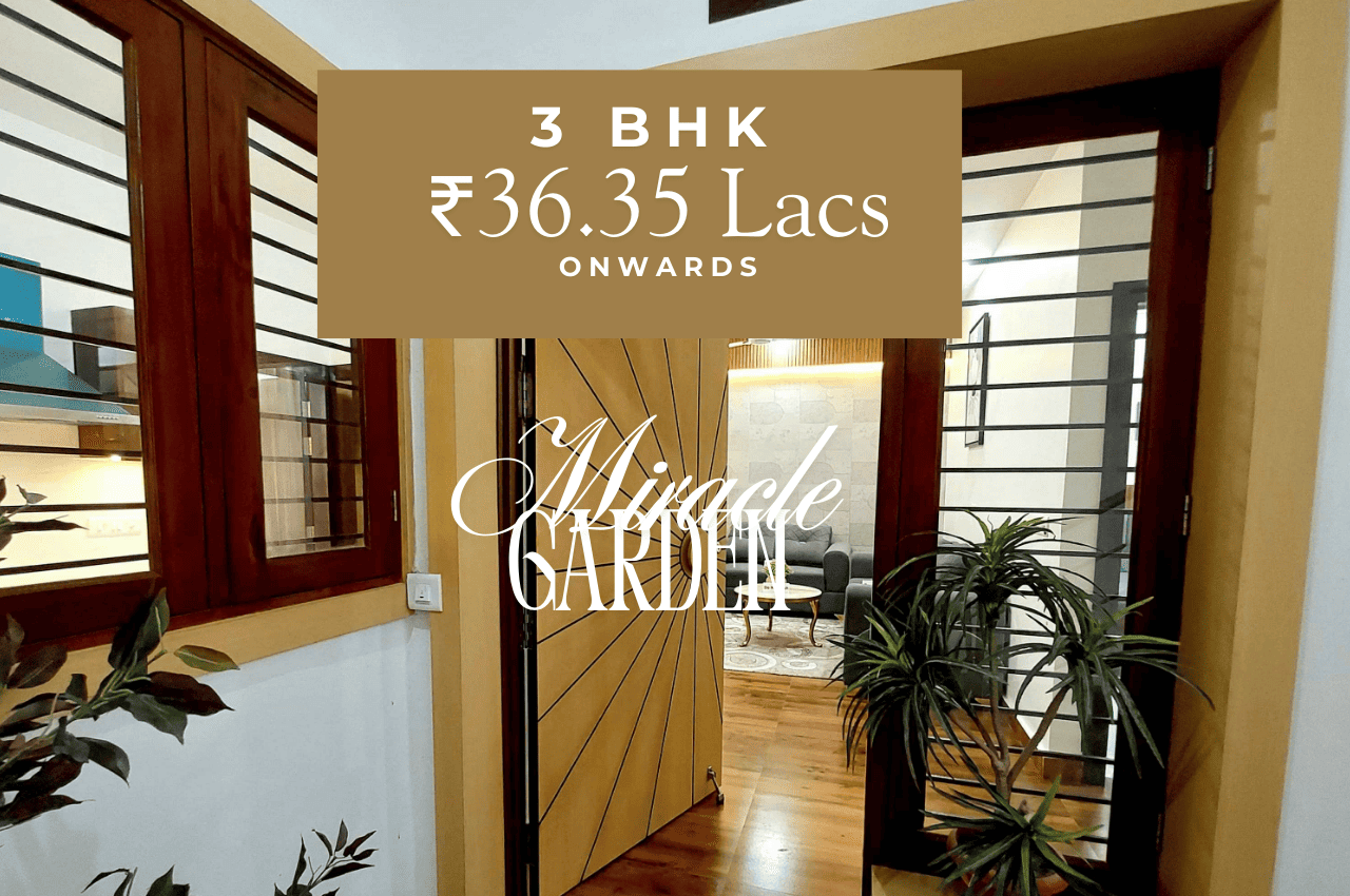 3 BHK Flats in Miracle Garden at Lucknow. Location: Opposite Shangrila Restaurant, Lucknow-Faizabad Road, Near Asseni Mode, Lucknow. 3 Bedrooms, 1 Hall, Semi-Modular Kitchen, 2 Bathrooms Super Area: 1144 Sq. Ft.